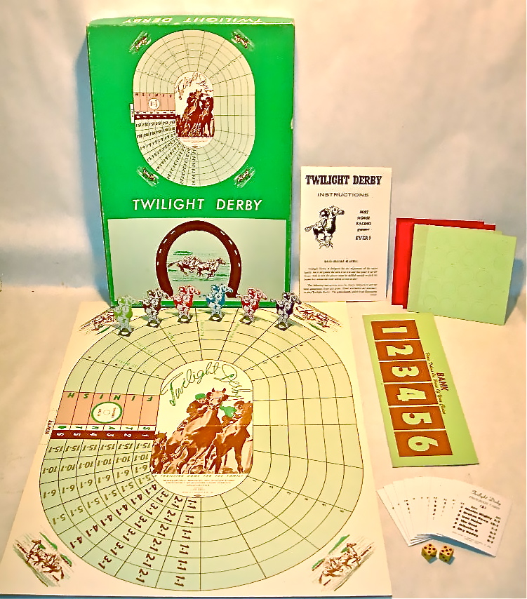 Published April 24, 2014 at    751 × 854 in    1944 Twillight Derby board game from Burnside Game Company, Cincinnati Ohio